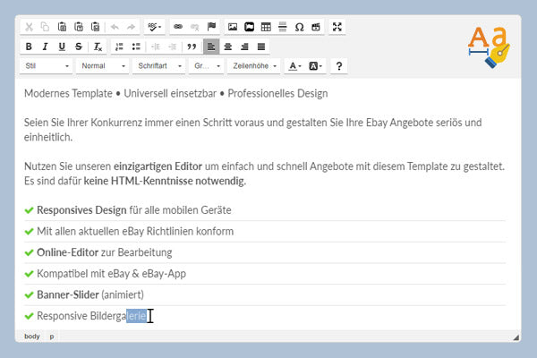 Ein eBay Template ist eine auf HTML basierende Vorlage für Ihre Artikelbeschreibung bei eBay. Mit Hilfe eines Templates erstellen Sie hochprofessionelle und seriöse eBay Angebote. Ihre Produkte können so modern und einheitlich dargestellt. Durch ein eBay Template erhalten Ihre Produkte eine gegliederte Grundstruktur.