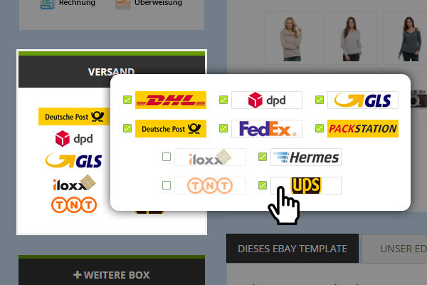 Mit einfachen Klicks kannst Du die Versanddienstleister im Editor auswählen, die Du verwendest.
