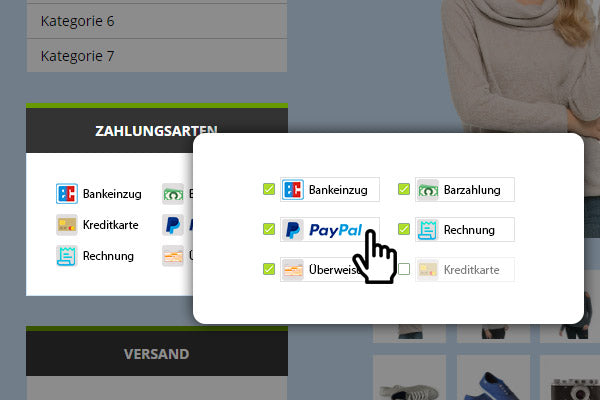 Zahlungsarten können, ebenso wie die Versanddienstleister, ganz einfach mit einem Klick an- und abgewählt werden.